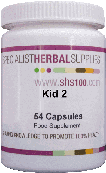 Kid 2 Capsules: (Min per Vegan capsule) Buchu 80mg, Cleavers 80mg, Uva Ursi 40mg, Parsley 40mg, Corn Silk 40mg, Ginger 40mg.